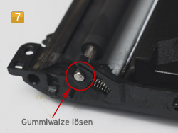 Wenn Sie den Alttonerbehälter heruntergenommen haben, ist an dem Behälter noch eine Gummiwalze angebracht. Da die Gummiwalze nur eingeklemmt ist, können Sie diese vorsichtig herausnehmen (Abbildungen 7 und 8).