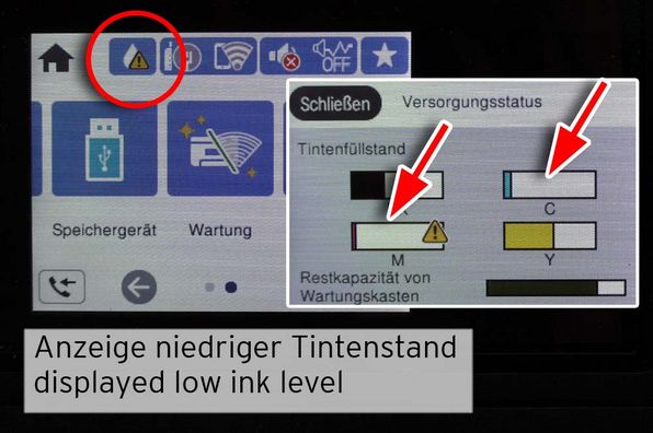 Secondo il numero di pagine stampate, il livello d'inchiostro di una cartuccia indicato dal chip d'inchiostro diminuisce gradualmente. Quando una delle cartucce ricaricabili per Epson 407 raggiunge un basso livello d'inchiostro, un punto esclamativo viene già visualizzato sul simbolo della goccia d'inchiostro nel display generale dello schermo della stampante. Nella vista dettagliata dello stato di fornitura si può quindi vedere esattamente quali cartucce hanno un livello di inchiostro basso. Si prega di resettare immediatamente il chip d'inchiostro sulle cartucce con un livello d'inchiostro così basso e di ricaricare con il colore d'inchiostro appropriato della stampante.